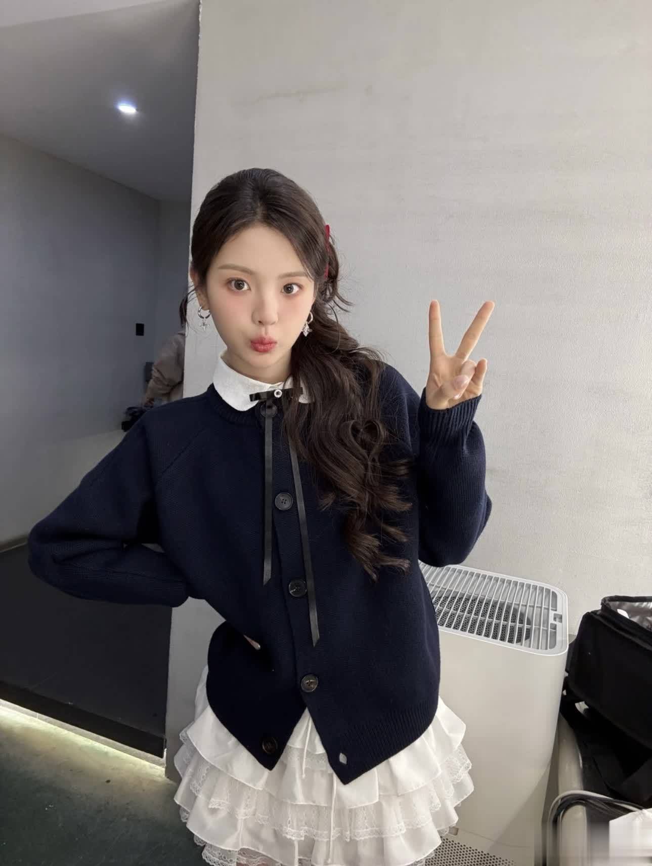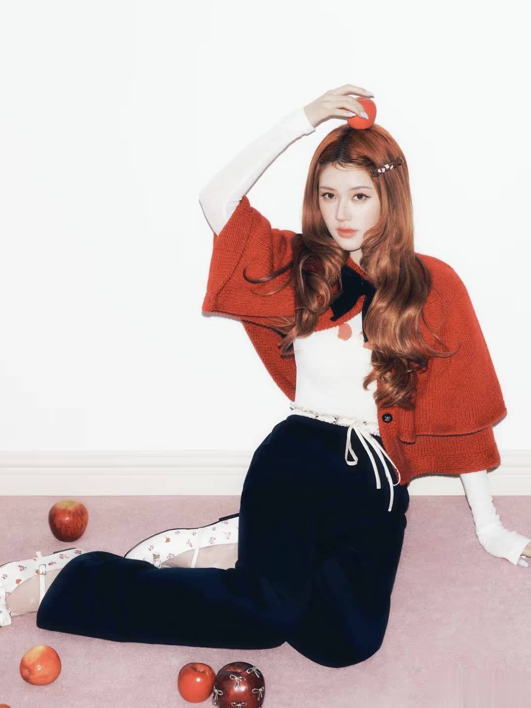 吴宣仪身穿红色娃娃领诚挚上衣搭配白色蛋糕裙,白色的裙子与诚挚上衣的白边相呼应,一整个这个词软萌可人。