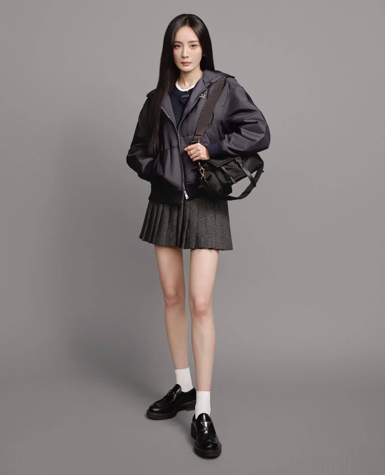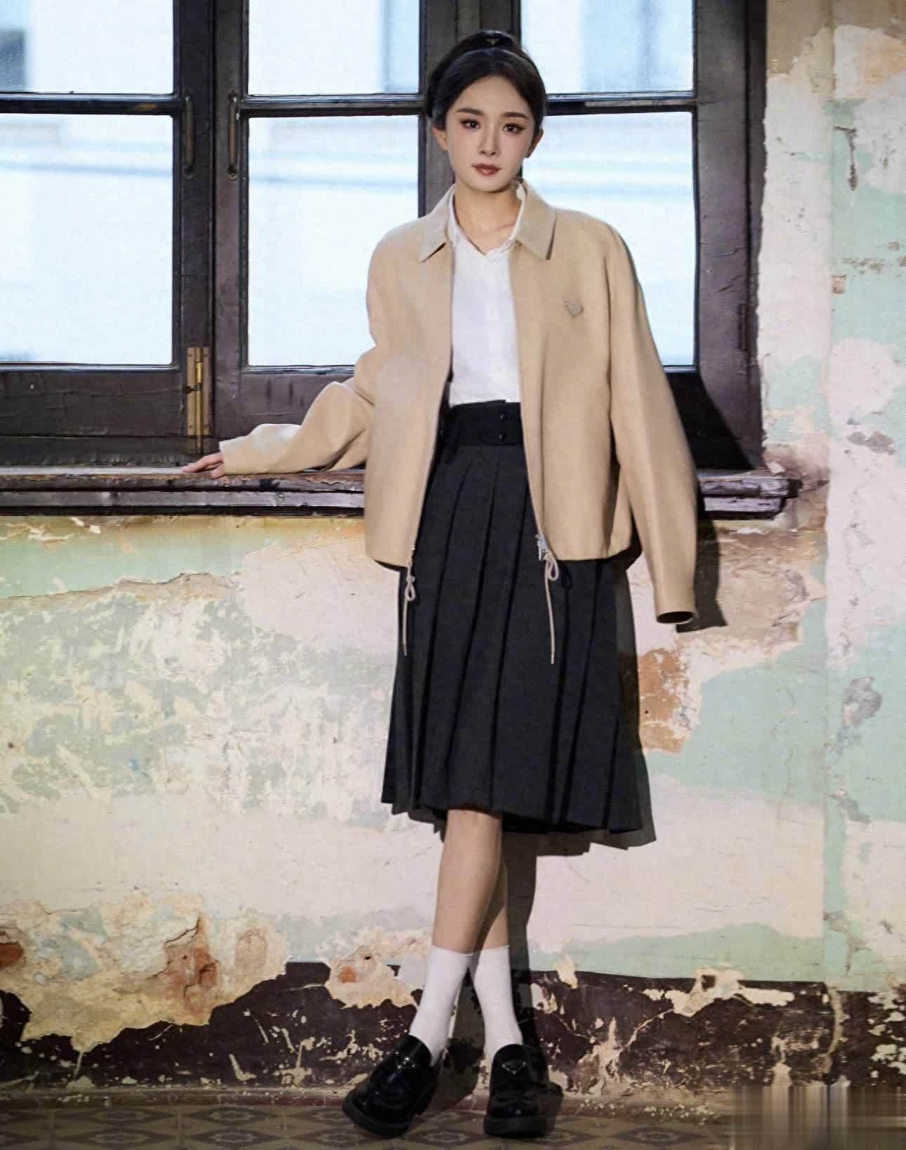 恭喜杨幂成为Prada无履行期代言东谈主,其实杨幂与Prada的调性还是相比搭的,一件卡其色质感外衣内搭白色衬衫+玄色百褶裙,整套穿搭齐显得十分俏皮与汜博,小白袜和小皮鞋的加捏,满满的校园气味。