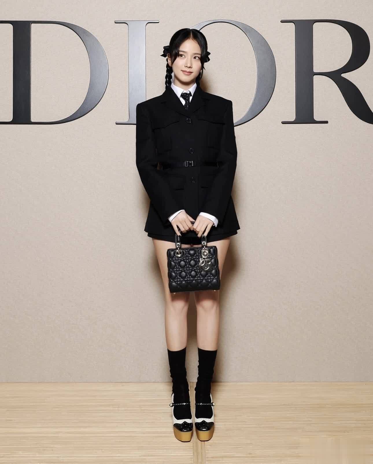 裸粉色波点衬衫上的山茶花系带立体而缜密,搭配黑丝绒小香风外衣和短裙,小香风套装裙上的对峙点缀自带闪光感。