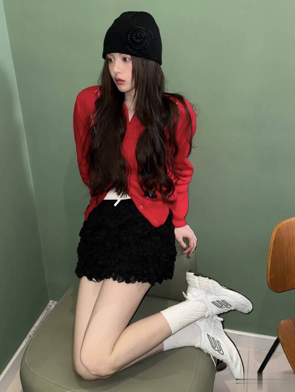 红色毛衣搭配玄色短裙,亦然自带节日氛围感的一套look,白色通顺鞋的搭配会愈加安闲与轻佻。