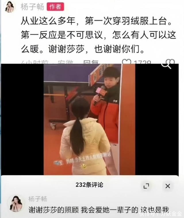 过后,杨子畅有益发文感谢孙颖莎:谢谢莎莎的顾问,我会爱她一辈子的。这亦然我第一次穿羽绒服上台,身心齐很暖。