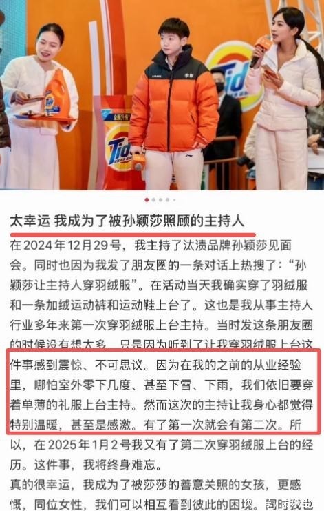网友将这一画面与孙颖莎事件关联,酿成话题#央视主握东说念主穿大衣主握,孙颖莎的话含金量还在飞腾#。