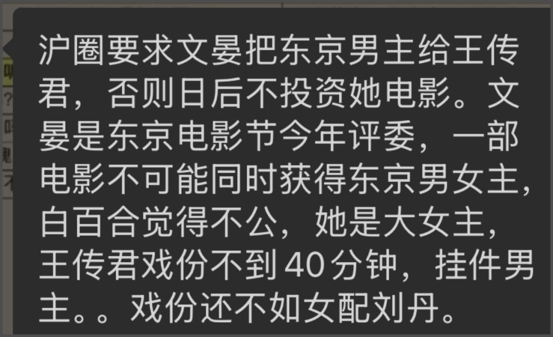 白百何发文风云抓续发酵,有网友爆料是因为沪圈为王传君撕下东京电影节影帝,白百何这个《春树》中戏份最多的女主反倒颗粒无收开云体育(中国)官方网站,惹得她屡次发文内涵,也引起网友争议。