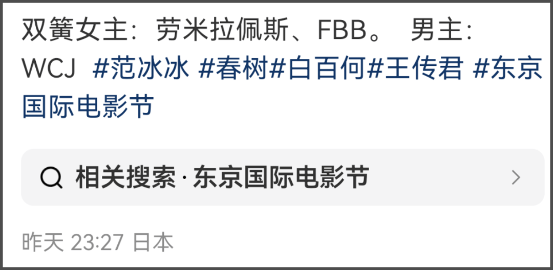 而更纳闷的是,此次东京电影节影后疑似是“双黄蛋”,有日本ip网友爆料东京电影节最好女主是劳米·拉佩斯和范冰冰。
